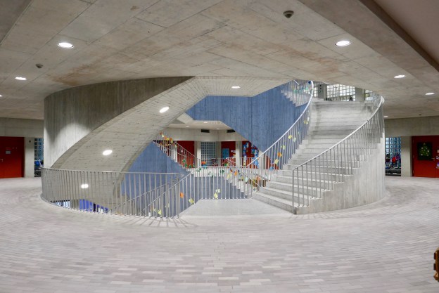 Wenn ich in das neue Schulhaus „Vinci“ eintrete, gelange ich ohne Umwege in die Mitte des Hauses. Der zentrale Raum mit den geschwungenen Treppen reicht bis unter das lichtdurchlässige Dach. Jeder Raum, sei es ein Klassenzimmer, die Bibliothek oder eine Toilette, wird über diesen Raum erschlossen. Jede und jeder durchwandert die Halle beim Kommen, und auch wieder beim Gehen. Es ist ein Ort der Bewegung und der Begegnung von Menschen, klein und gross. Jede Tür, die man von diesem Raum aus durchquert, führt in einen Raum, der spezifischer, ruhiger, und gewissermassen privater ist.